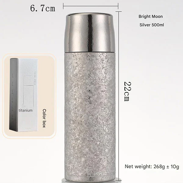 Titanyum Su Şişeleri çift katmanlı bir vakum yalıtım tasarımına sahiptir. Metal su şişelerimizin, ister soğuk kola ister sıcak kahve olsun, içecekleriniz için en iyi yalıtımı sağladığı kanıtlanmıştır. Sıcak içecekler 8 saate kadar, soğuk içecekler ise 12 saate kadar sıcak tutulabiliyor. (Deneysel veriler: Yalıtım: 99°C oda sıcaklığında su ekleyin ve 6 saatlik yalıtımdan sonra sıcaklık 60°C'yi aşacaktır; Soğutma: 0°C oda sıcaklığında su ekleyin ve 6 saatlik yalıtımdan sonra sıcaklık 5°C'nin altına düşecektir.)