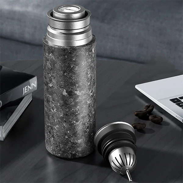 Bu, 410ml kapasiteli bir havacılık malzemesi olan titanyumdan yapılmış manyetik kapaklı bir titanyum su şişesidir. Düzenli bir termos kabının temel fonksiyonlarına sahiptir: vakum ısısı koruma ve soğuk koruma. Soğuk koruma 6 saat sürebilir ve ısı koruma 4 saat sürebilir.